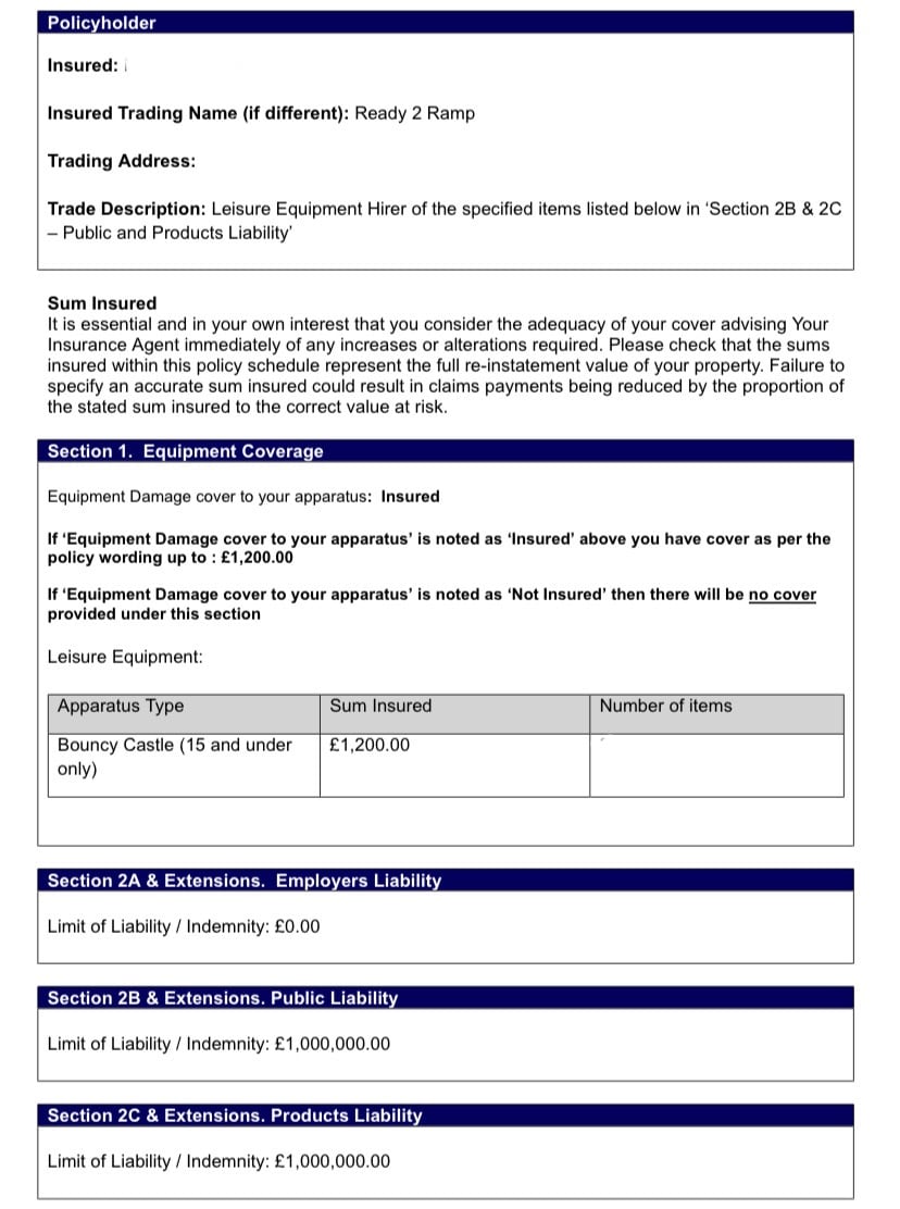 - Ready2ramp Bouncy Castles - £1 Million Public Liability Insurance